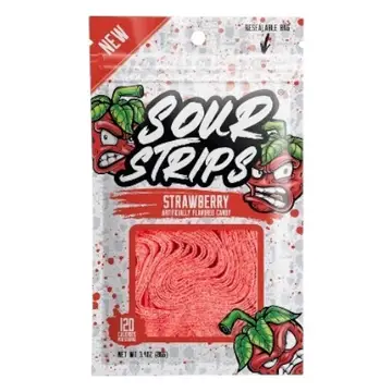 Sour Strips Strawberry hits hard with electric sourness and bold berry flavor. These flat, chewy ribbons deliver a satisfying snap followed by a sugar rush that makes your lips pucker and your taste buds dance.